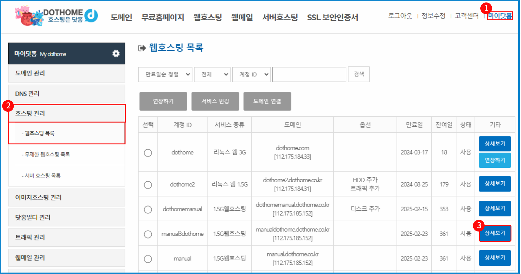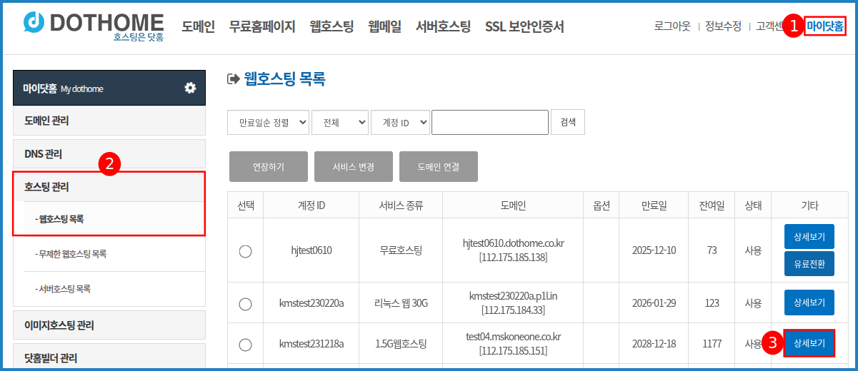 닷홈 홈페이지에 로그인하신 뒤 ① [마이닷홈]-②[호스팅 관리]-[웹 호스팅목록] 에서 변경하려는 서비스의 ③[상세보기] 버튼을 눌러주세요.
