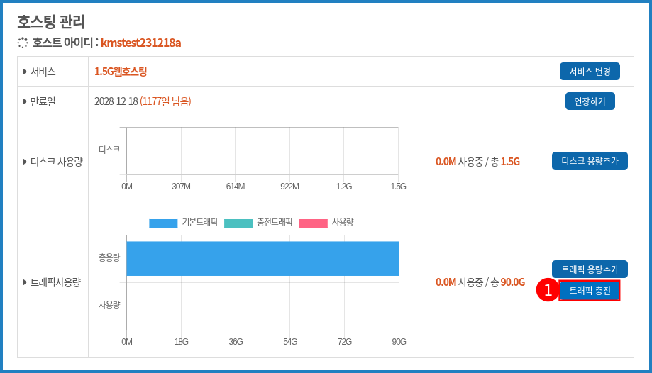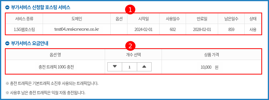 호스팅 상세보기 페이지에서 ①[트래픽충전] 버튼을 클릭하여 트래픽 중전을 할 수 있습니다.