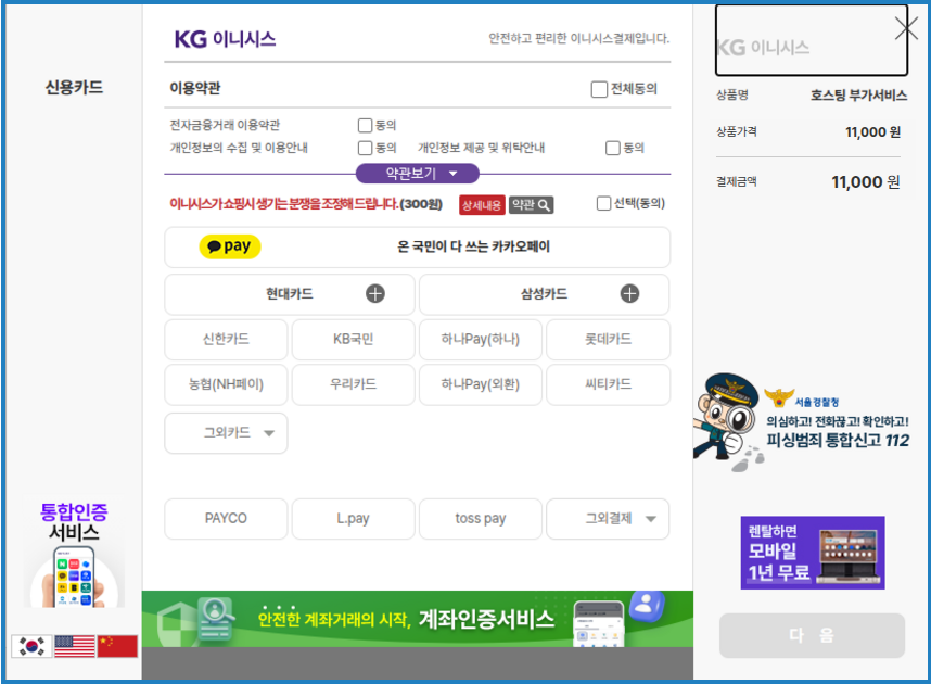 [웹호스팅 옵션 추가 결제수단 선택 화면]