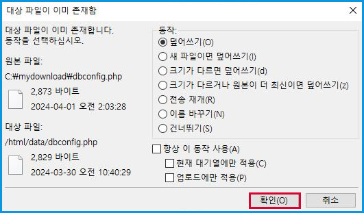 이후 FTP를 통하여 수정한 dbconfig.php 파일을 업로드합니다.
