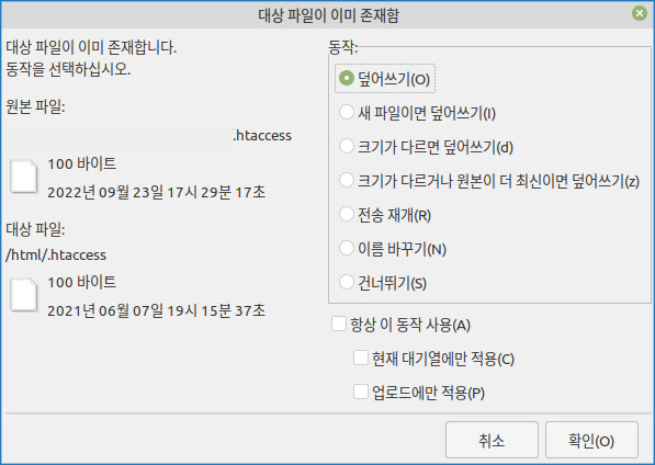 [웹호스팅 .htaccess 파일 덮어쓰기 화면]