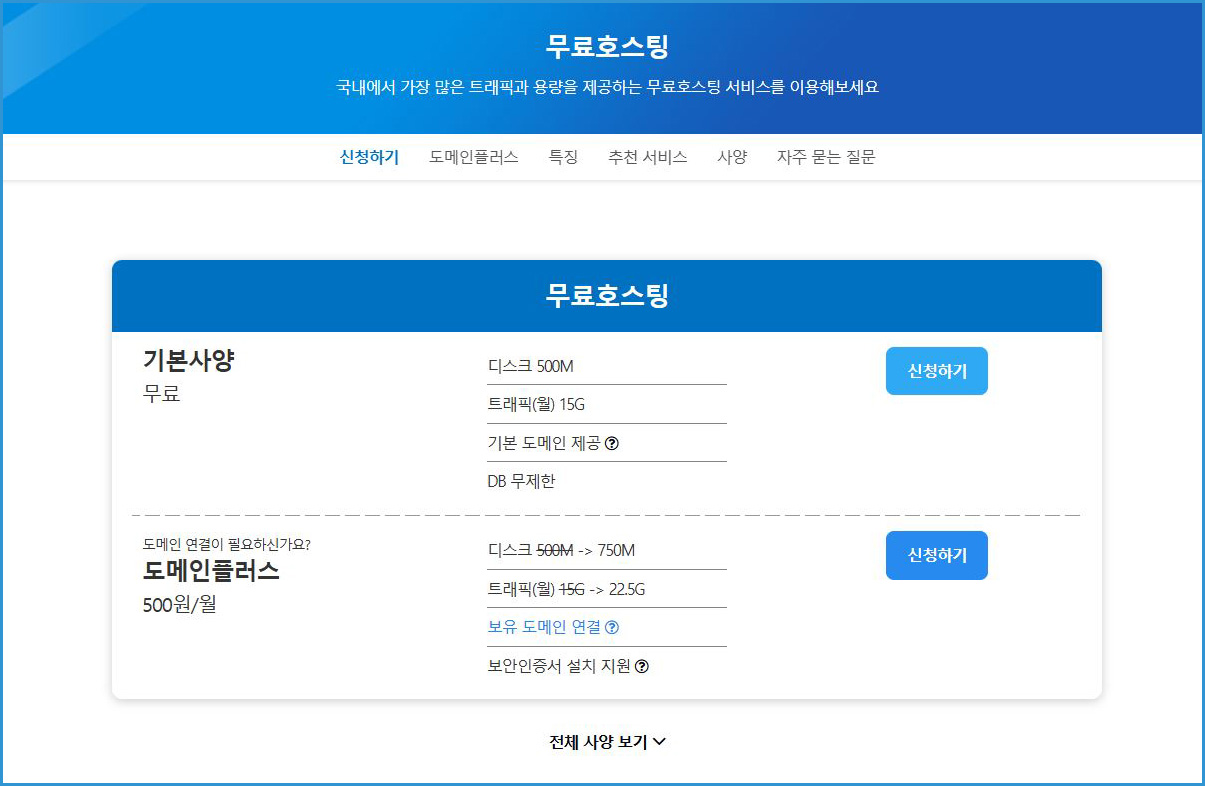 무료호스팅 상품의 자세한 사양은 아래 링크에서 확인해 주시기 바랍니다.