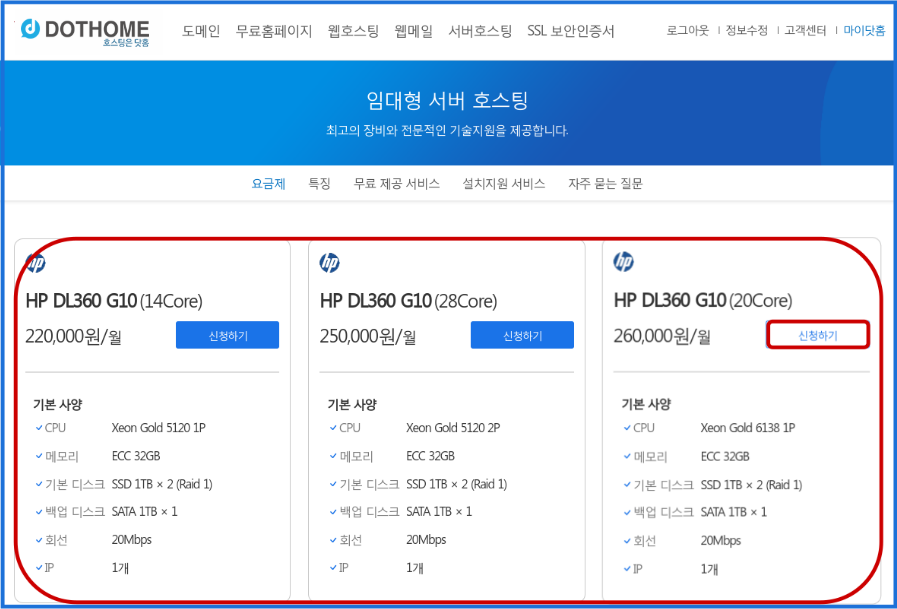 각 상품의 사양을 비교하여 적합한 서비스를 선택하신 다음 선택하신 서비스 ①[신청하기] 버튼을 눌러줍니다.