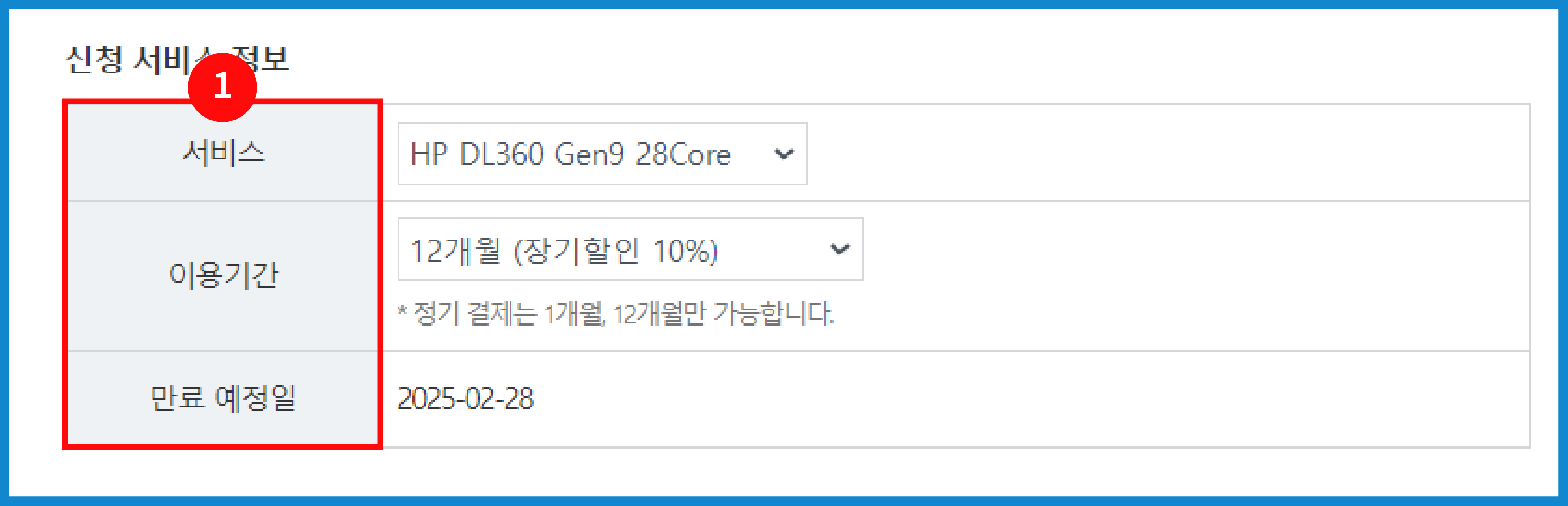 | 이용 기간 | 서비스 이용 기간을 설정합니다. 1개월에서 최대 36개월까지 설정 가능하며 6개월 이상은 장기 할인이 적용됩니다. |