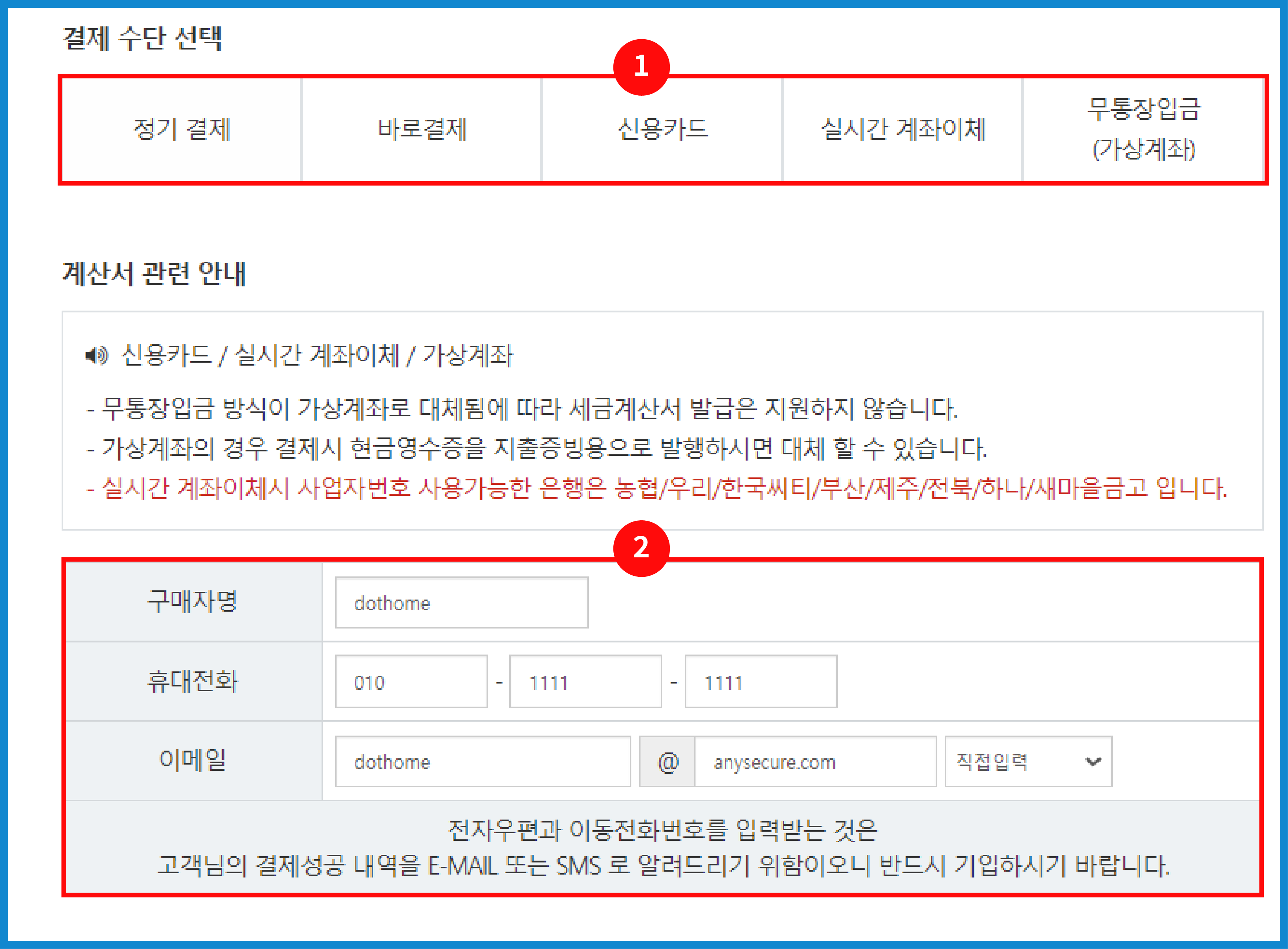 아래 표를 참고하여 결제수단을 선택하고 구매자 정보를 입력해 줍니다.