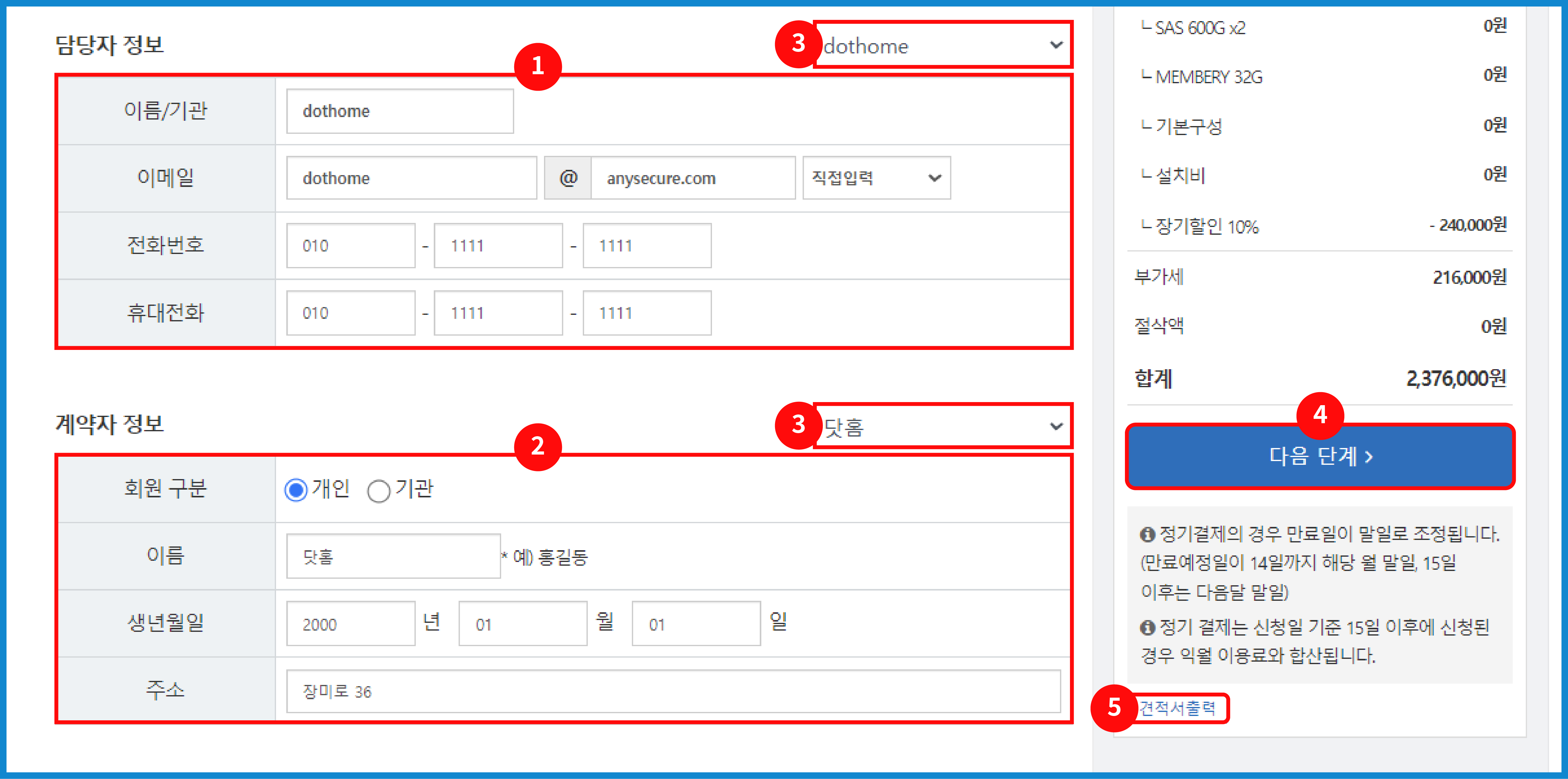 아래 설명을 참고하여 담당자, 계약자 정보를 작성해 주신 뒤, ④[다음단계] 버튼을 눌러주세요.