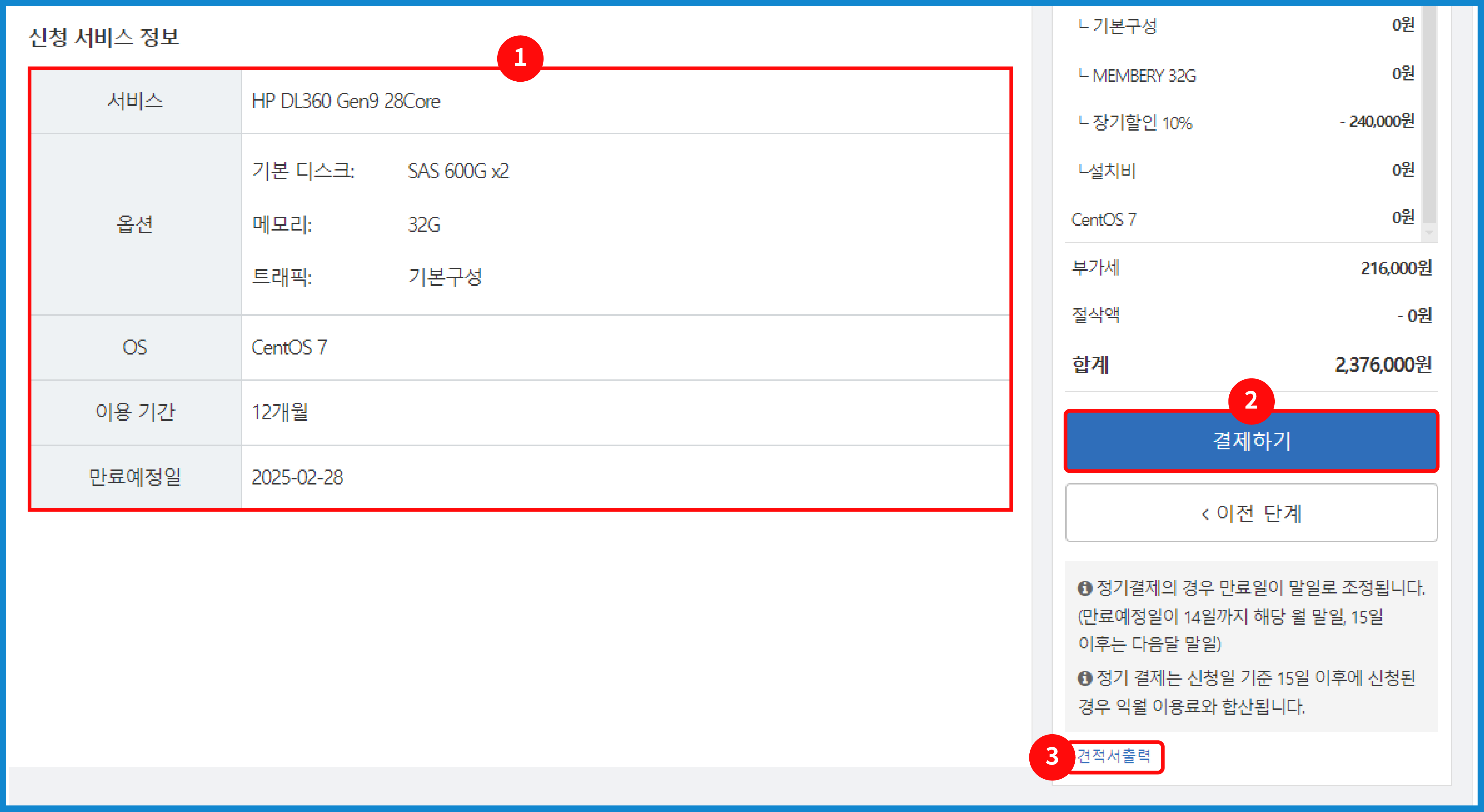 서비스 정보 확인 및 약관 동의를 마치셨다면 ③[결제하기] 버튼을 눌러주세요.