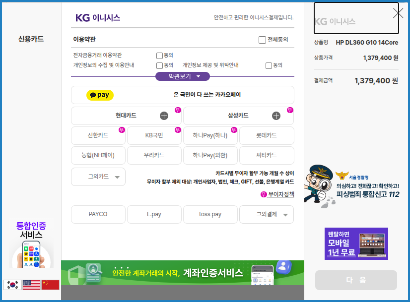신용카드 결제 시 나오는 결제창으로 본인이 편한 결제 방법을 결정 후 결제를 진행해 주세요.