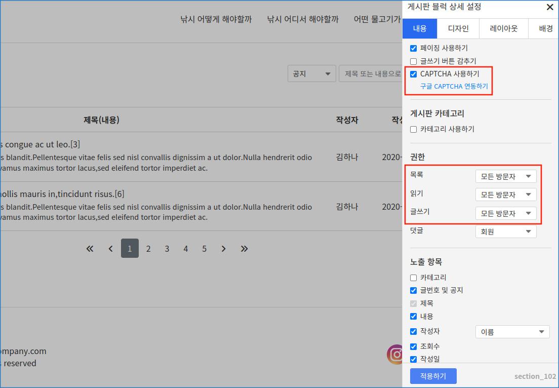 다만, 글쓰기 권한이 “모든 방문자”인 경우는 캡챠를 필수로 사용해야 하므로 아래 매뉴얼을 참고하셔서 캡챠 설정을 추가해주시기 바