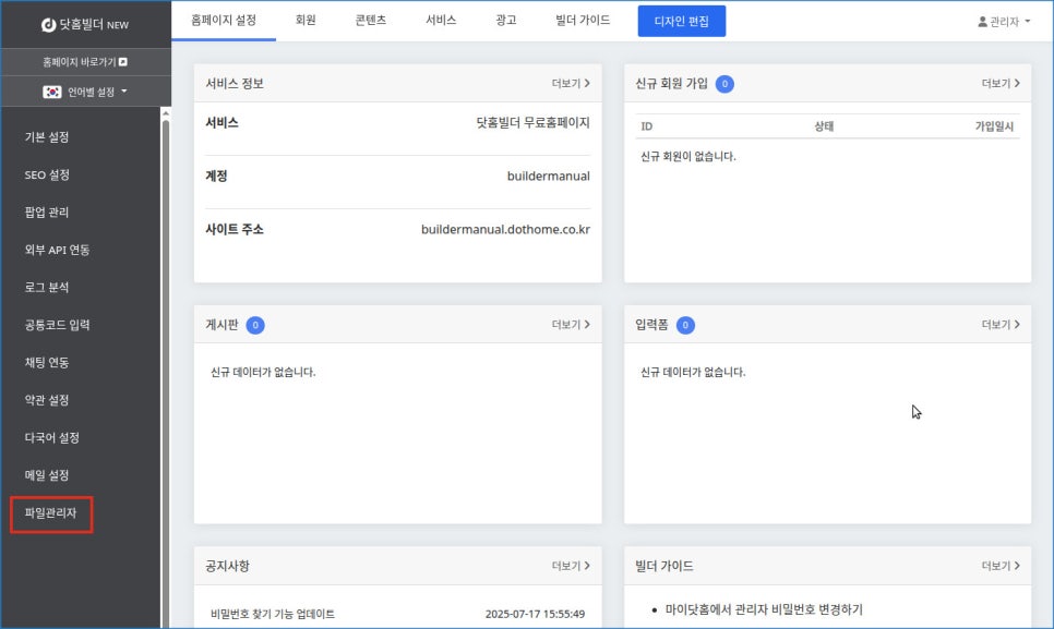 닷홈빌더 관리자 페이지에 접속 후 좌측 메뉴 가장 하단의 "파일관리자"를 클릭합니다.
