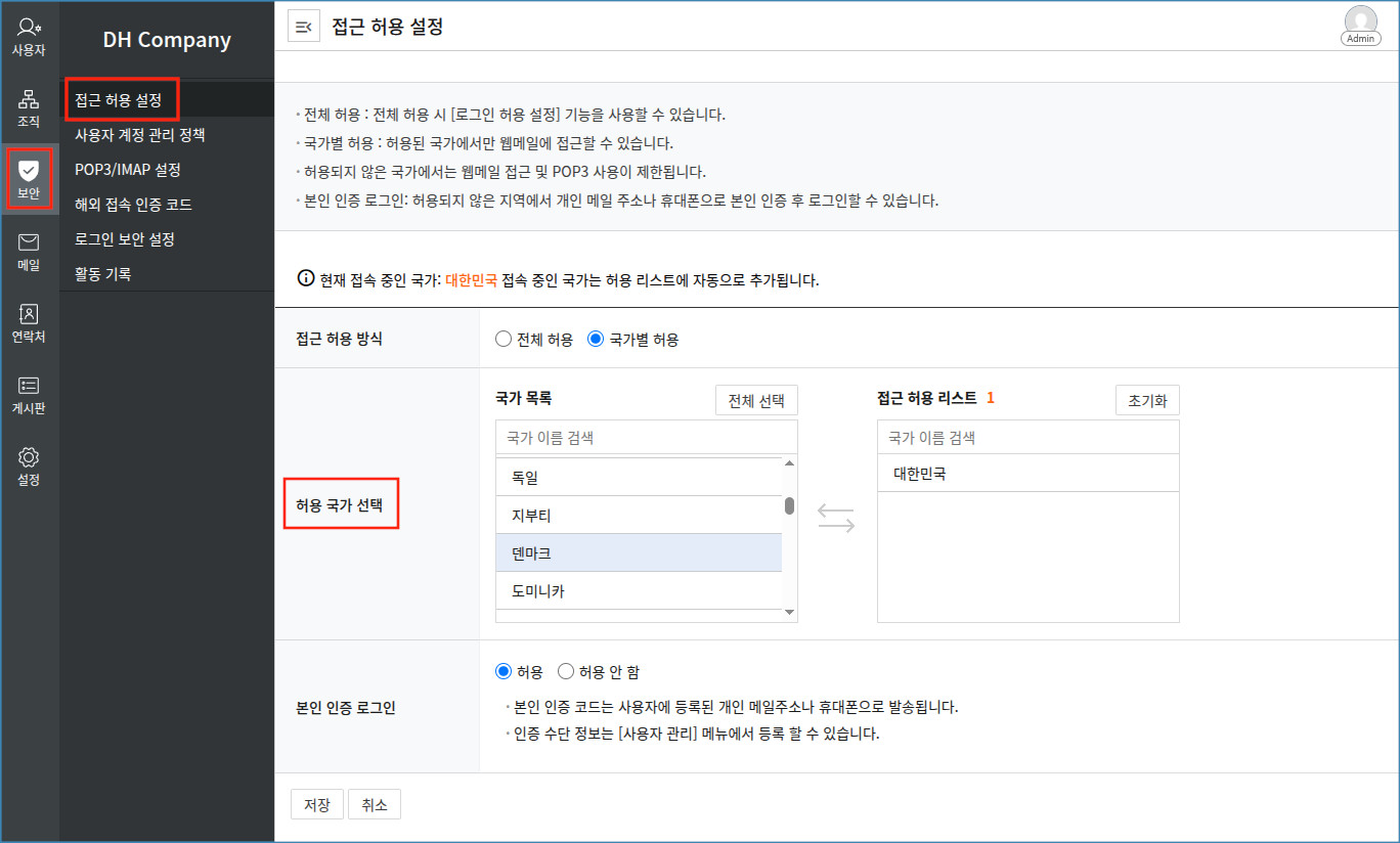 무제한 웹메일 관리자 로그인 후 좌측 [보안] - [접근 허용 설정] 페이지로 이동합니다.