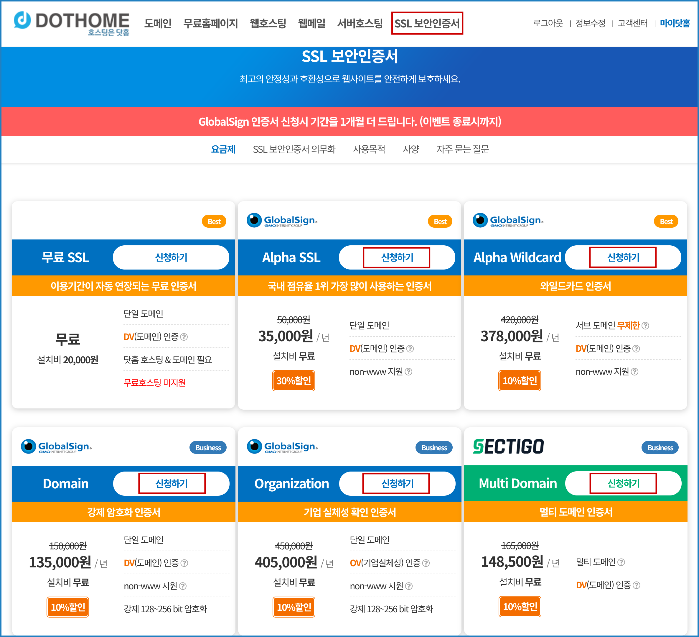 1. [SSL 보안 인증서]의 Globalsign, Sectigo 인증서 "신청하기"를 눌러 서비스 신청페이지로 이동합니다.