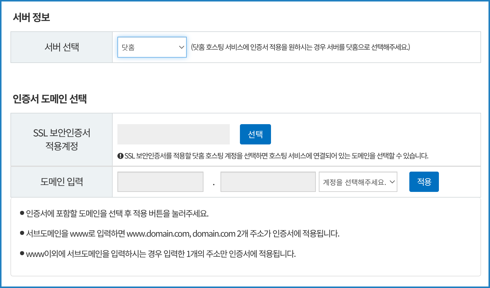 2. 서버 종류와, 인증서를 적용할 도메인을 선택한 후 "적용"합니다.